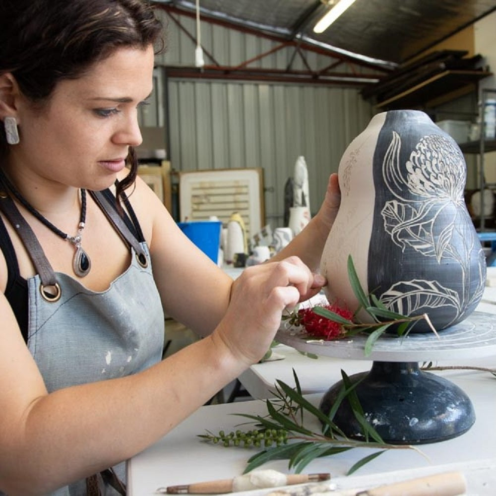 Danica Wichtermann is a ceramic artist and teacher based in the hills of Kalamunda, Perth. Her work reflects a passion for the native flowers and birds of Australia, as well as threatened species within Western Australia. Her porcelain clay vessels are wheel thrown before illustrations and stylised designs are hand-carved into the surface.