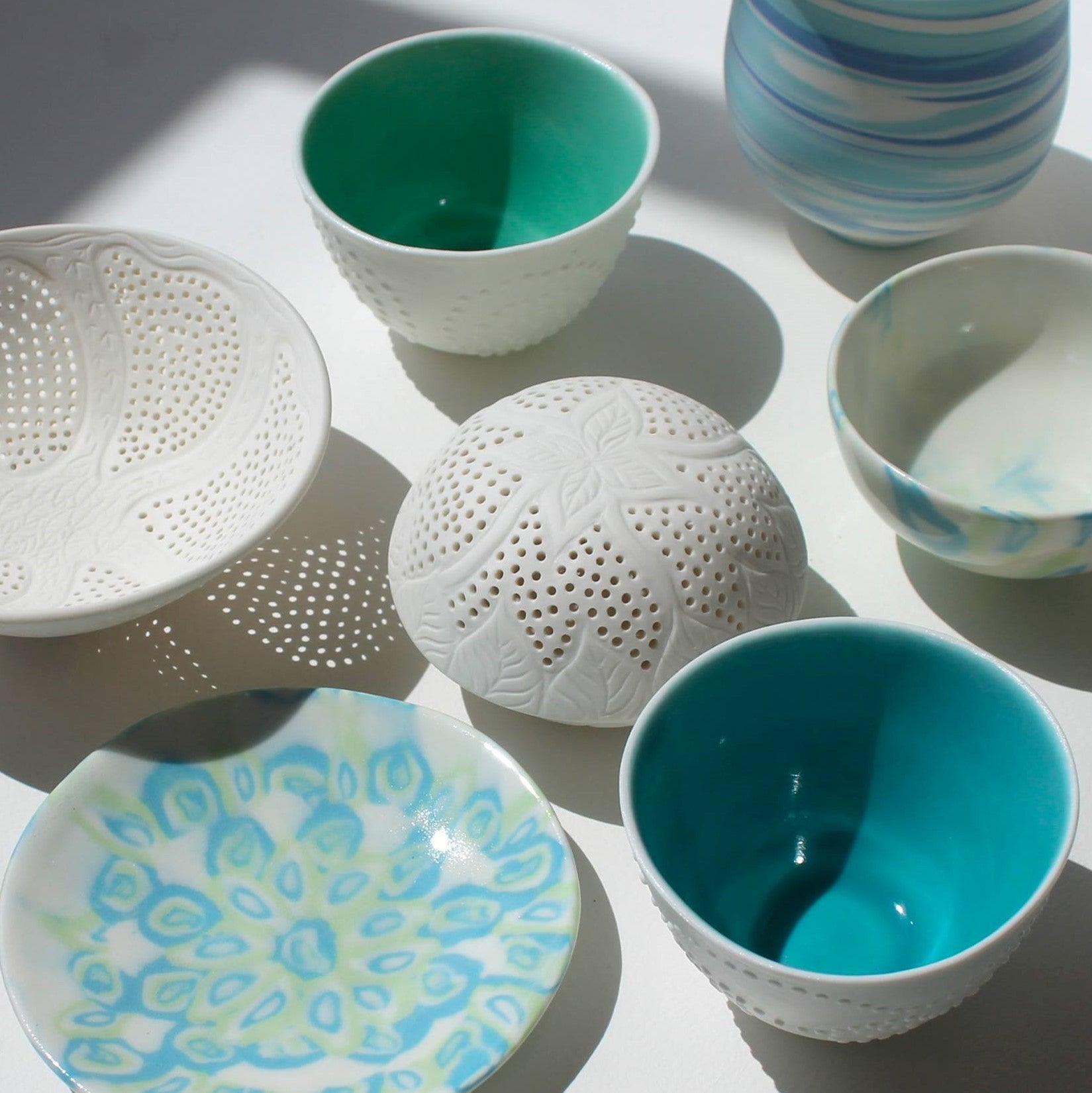 Dariya’s ceramic pieces are based on a series of simplistic vessel shapes, brought to life with design intricacies, etching and a cool, calming colour palette.