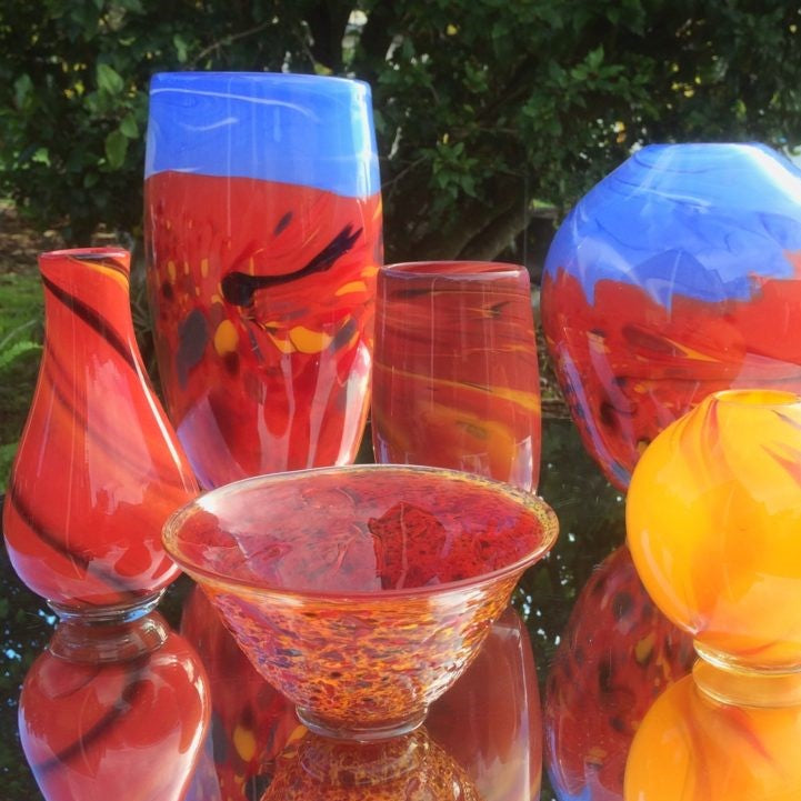 Gerry has been blowing glass in Western Australia since the early 1980s, after completing his early training on the east coast he is now based in the Margaret River at The Melting Pot Glass Studio. His unique designs and vibrant colours have marked his continuing presence in the Australian Studio glass movement. Over the years he has spent his time working in small studios and attending numerous workshops in advanced techniques with glass artists from Italy, USA, England and Australia.