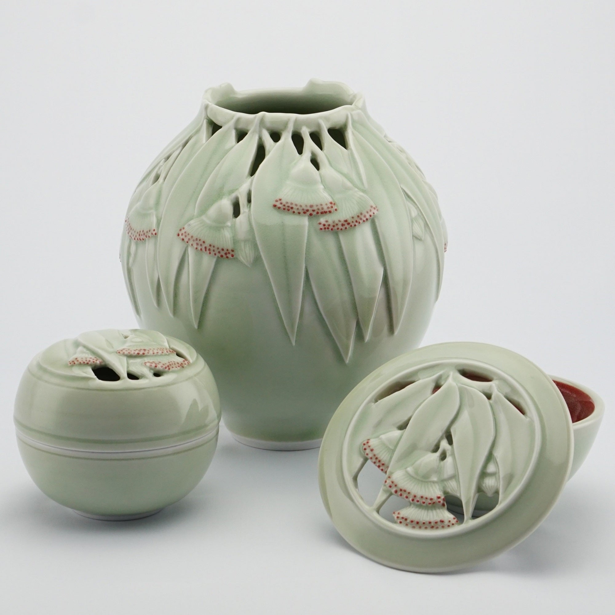 With the assistance of the Western Australian Department of Culture and the Arts, Mary has been developing a range of ceramics to reflect her Australian environment. She is currently working on a series featuring Australian plants. These include the Silver Princess (Eucalyptus caesia), the Kangaroo Paw, the Hooded Lily and the imported Arum Lily which, while beautiful, is overrunning the farm lands around her home.