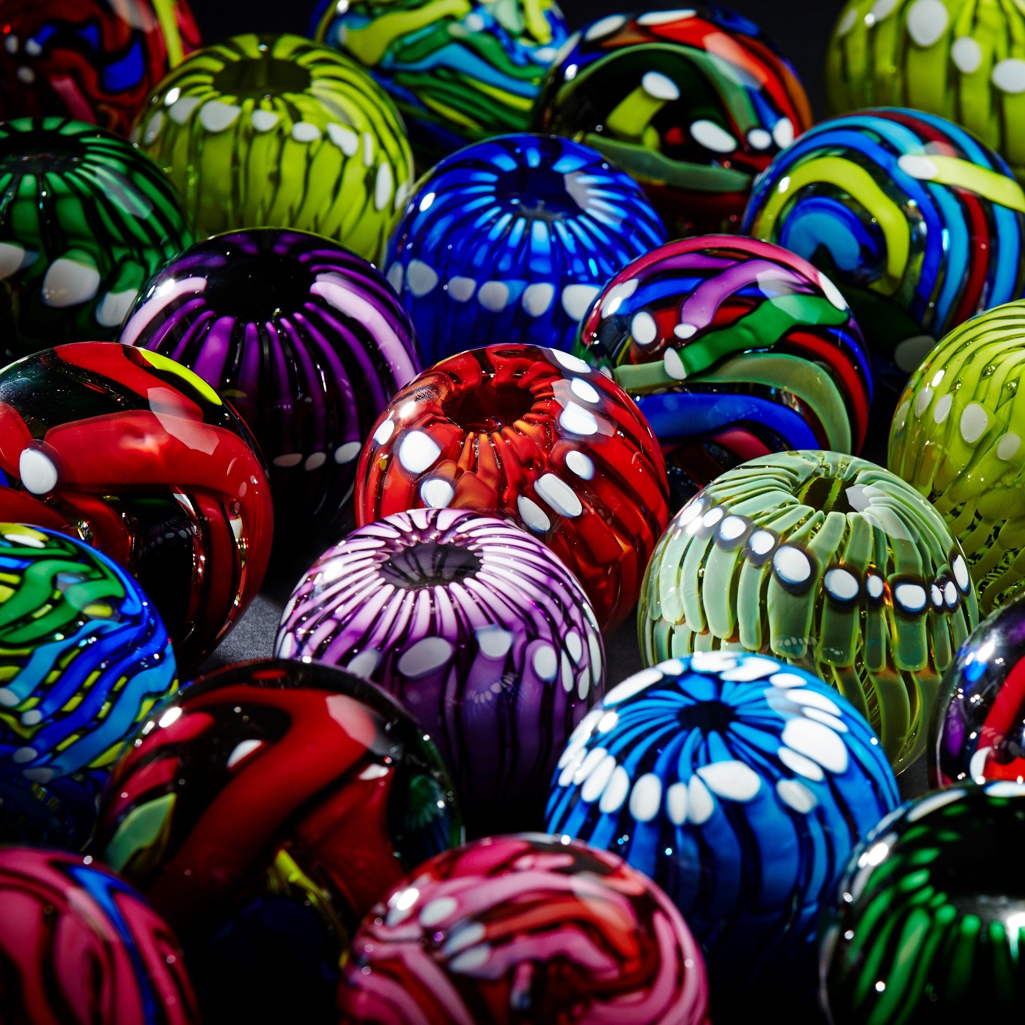 Patrick's work is created from hot-worked solid glass, influenced by both classical and primitive traditions of sculpture. He is interested in the body as the external expression of an internal existence. In addition to his sculptural pieces, he makes a range of colourful retro-inspired vases, paperweights and scent bottles.