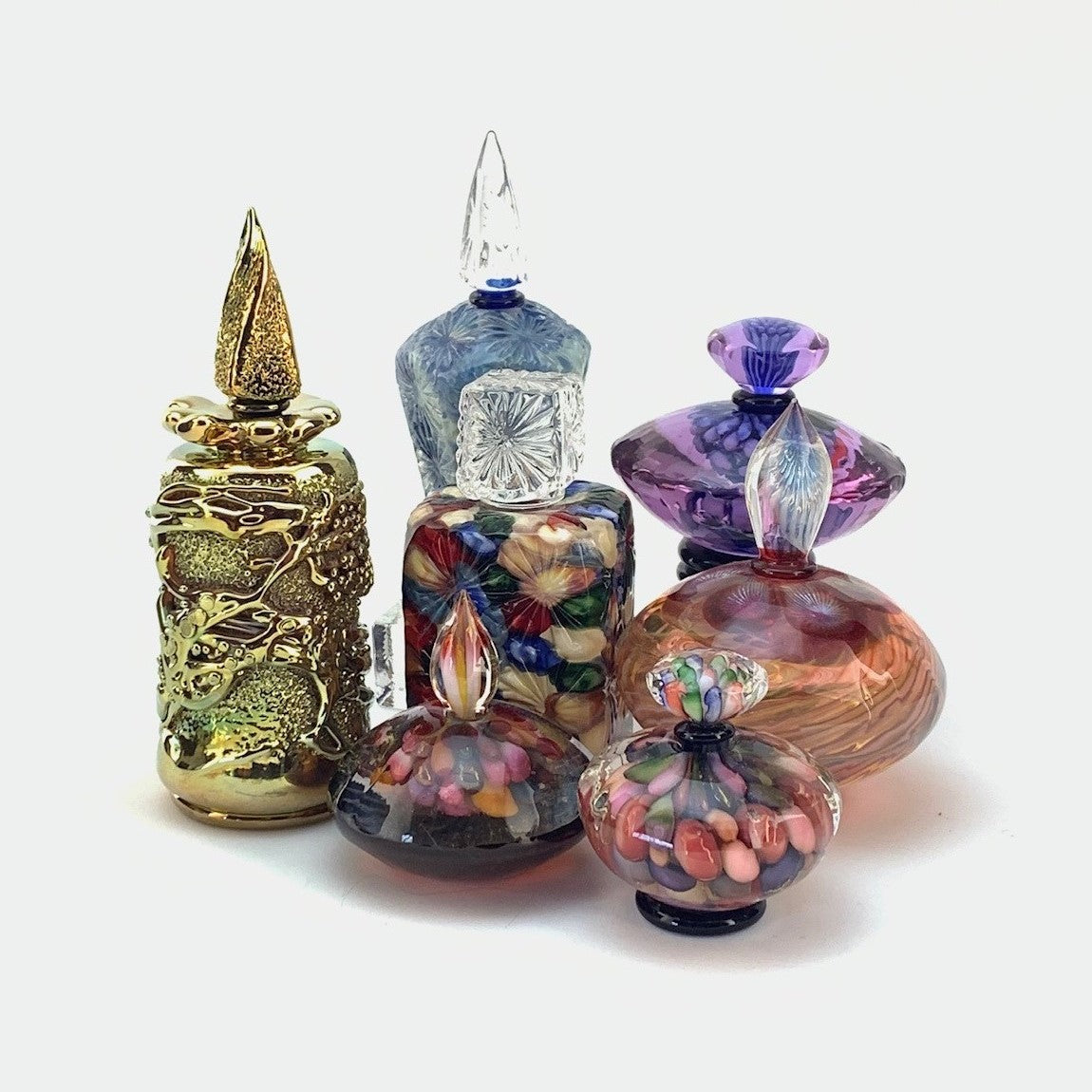 Richard has always worked with borosilicate glass which up until the last few years only came in clear so he began experimenting making his own colours first on the bench and then building furnaces to make larger amounts it was also at this time that he started making his first perfume bottles, today he says he still loves making them. The designs keep evolving, each piece is unique and like a jewel.
