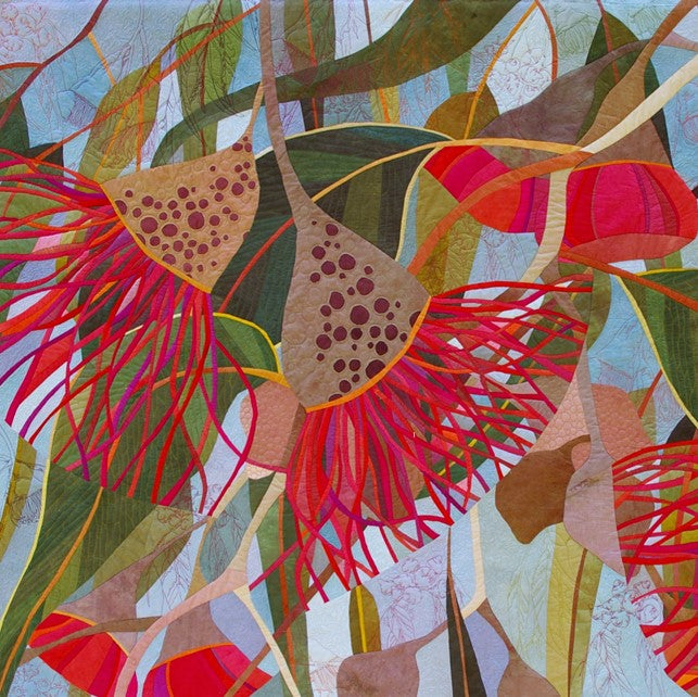 Ruth hand-dyes much of the fabric she uses for her quilt tops. The art quilts are pieced by machine in a process not too far removed from traditional patchwork techniques. Where a design requires it, Ruth will also incorporate screenprinting, to add texture or tell part of the story. Every artwork is completed with intensive machine stitching to quilt the layers of the piece together, as well as to add interest through texture and embroidered patterns.