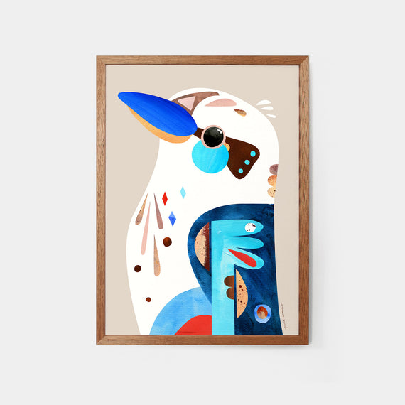 This is a fine art print from the original 'Kookaburra' collage and acrylic artwork by Pete Cromer.