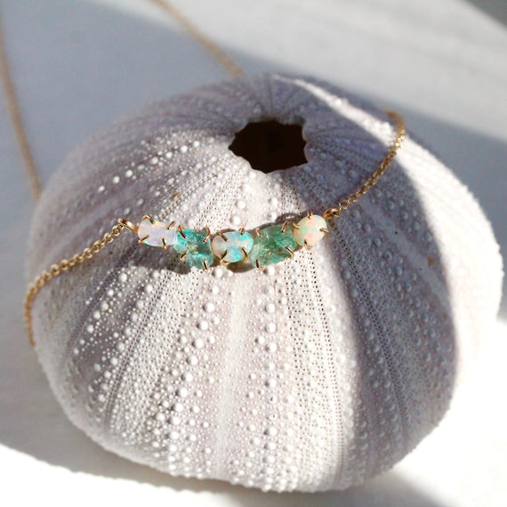 This stunning necklace features three raw opals and two raw apetites, and is available in sterling silver or 14ct gold-filled. Adjustable chain length.