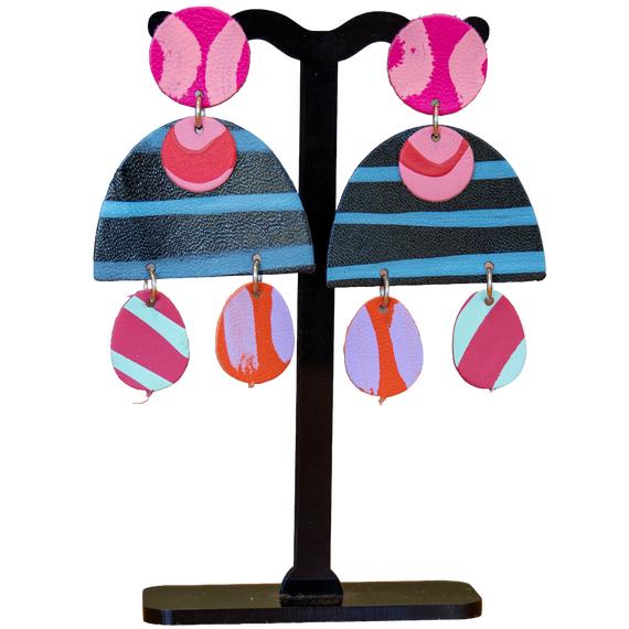 Transform your everyday look with these exquisitely handcrafted First Nations leather dangle earrings. Each pair is thoughtfully hand-painted with contemporary Indigenous designs by Palawan artist Bronwyn David and artfully cut into assorted shapes, suspended from premium titanium studs for lasting durability and style.