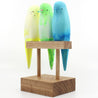 This perch can hold one to three of Pete Cromer's resin budgerigars and is made from solid Tasmanian oak.
