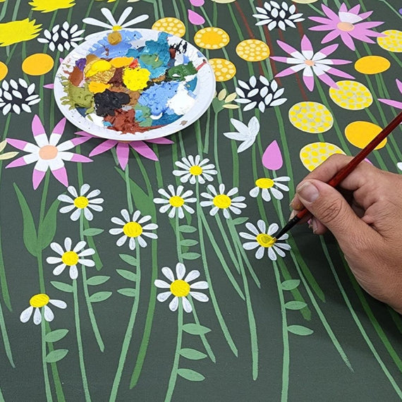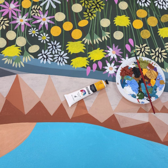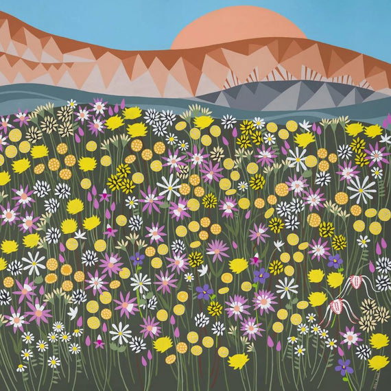 “The Coalseam National Park is located halfway between Mingenew and my hometown of Mullewa and is one of the biggest tourist attractions in this area. The place of the first mined coal deposit in Western Australia, the park gets its name from the exposed bands of coal seams that still stripe the cliff faces. 2021 was one of the most spectacular displays of wildflowers I had ever seen in this area – inspiring me to paint this painting of fields of pink and yellow flowers. I took a friend there with me who, at the time, said she was enjoying watching my over-the-top excited reactions to the wildflowers more than the wildflowers themselves!” - Helen Ansell