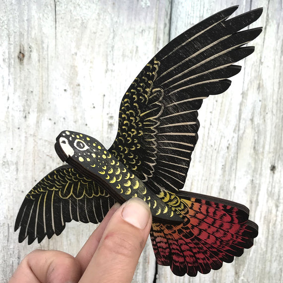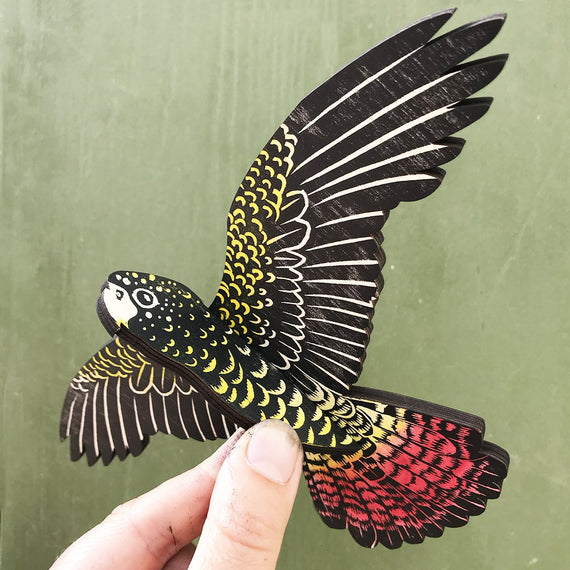 This is a mobile of a female red-tailed black cockatoo. It is made of strong, laser-cut, layered plywood and hand-printed in multiple layers from hand-cut lino plates.