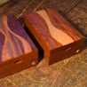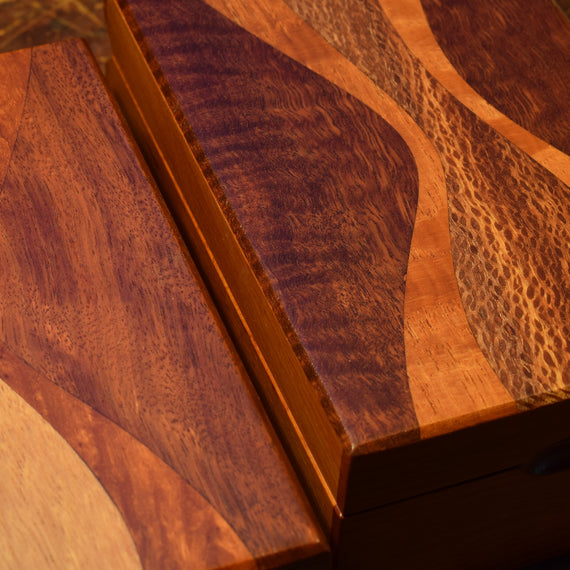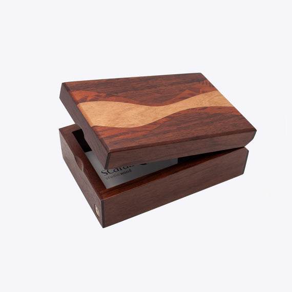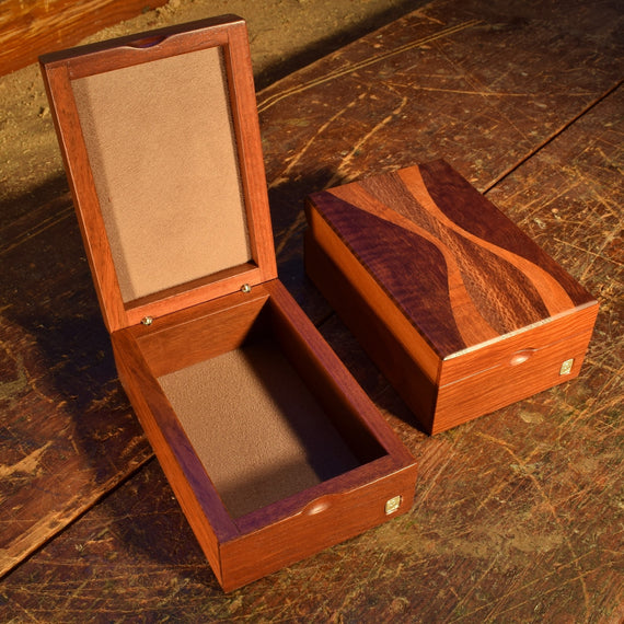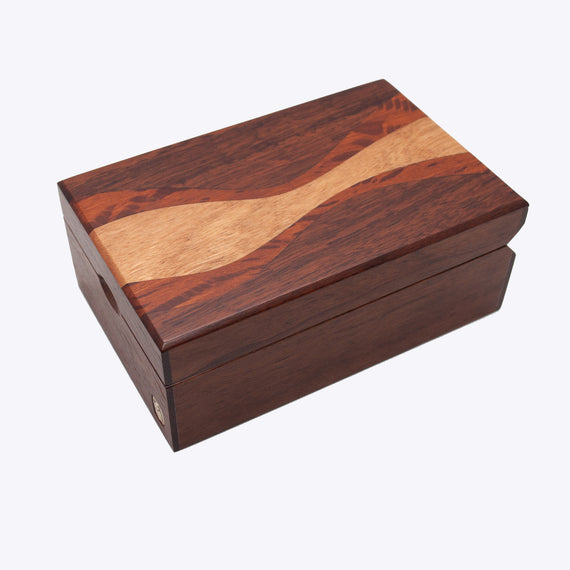 The Little River Box is crafted from jarrah and sheoak, with inlays of banksia and blackbutt. Inside, the box is lined with suede fabric in assorted colours.