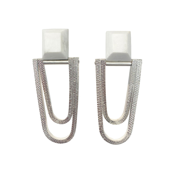 These U-shaped engraved sterling silver earrings feature a slice of faceted marbled white corian. The silver components swing with the wearer's movement.