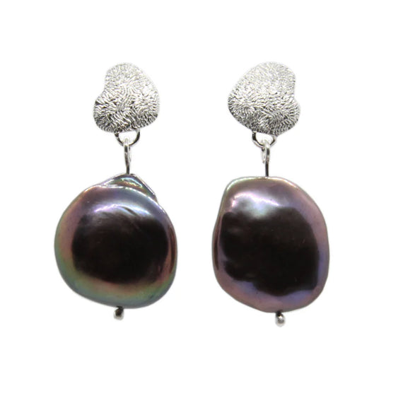 The Droplet Earrings are a contemporary take on the classic pearl earring. They feature magnificent baroque freshwater pearls - each pair incredibly unique. These hang from beautiful hand engraved sterling silver studs.