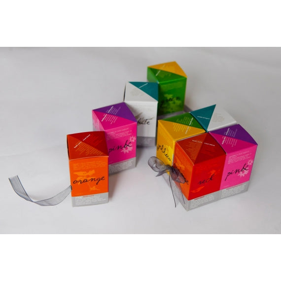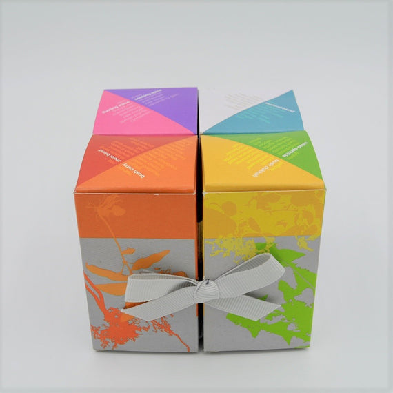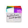 Ingredients: Blue - lemongrass, kaffir lime, mustard seed, pepper, finger lime, lemon myrtle, ginger and salt; Red - sesame seed, wattle seed, bush tomato, mustard seed, salt and mountain pepper berry; White – macadamia, lemon myrtle, sesame seed, finger lime, salt and pepper; Yellow – pecan, wattle seed, hazelnut, macadamia, sesame seed, salt, lemon myrtle and coriander; Orange – ginger, mustard seed, cumin seed, fennel seed, coriander seed, paprika, finger lime, bush tomato, mountain pepper berry and leaf chilli; Green – macadamia, bush tomato, sesame seed, lemon myrtle, pepper, salt and ginger; Pink - bunya nut, macadamia, quandong, raw sugar, lemon myrtle and cinnamon; Purple – macadamia, wattle seed, raw sugar and strawberry gum