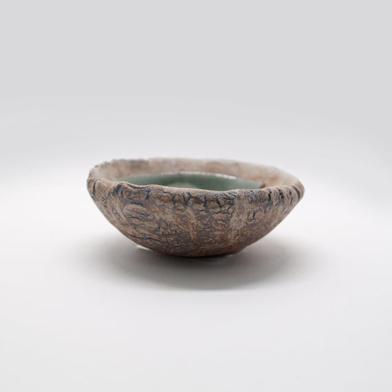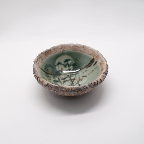 This ceramic dish features a distinctive crackle edge and a finely decorated interior, with an Australian bush design.