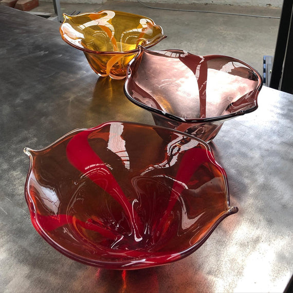 These gorgeous hand-blown glass bowls depict the delicate, unfolding blooms of colourful flowers.