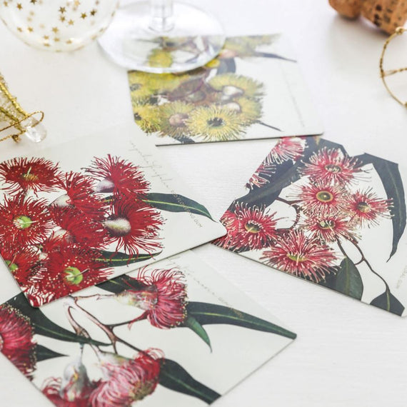 This set of eight double-sided coasters portrays some of the exquisite forms and colours of Australian eucalypts, depicted by West Australian botanical artist Meryl Bell.