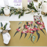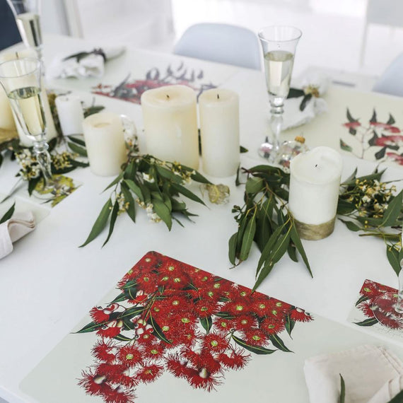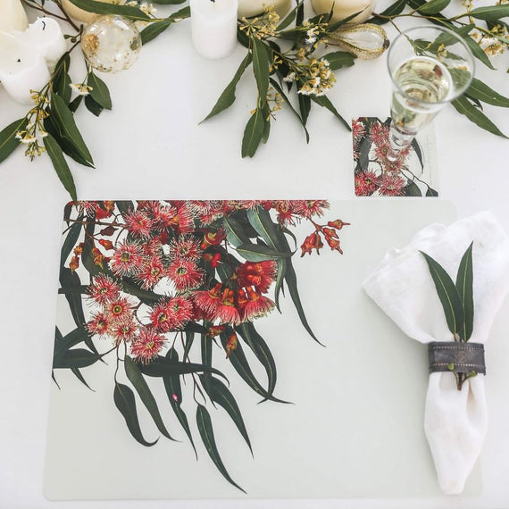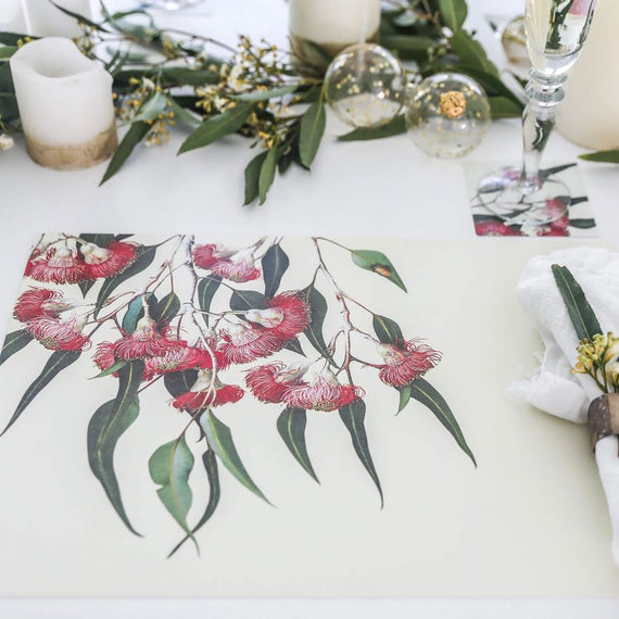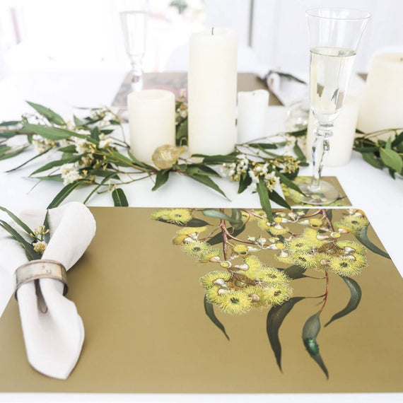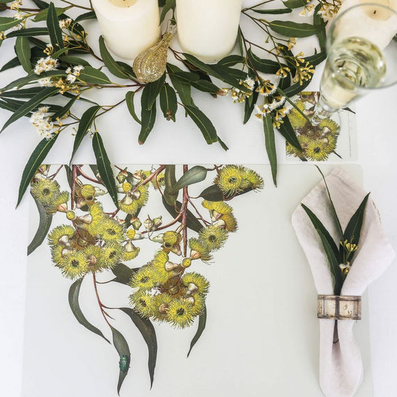 Eucalypt blooms are unique in the floral world for their intriguing form, variety and brilliant colour. Four of these stunning varieties feature on complementary backgrounds of ivory and gold to suit any décor. We hope these placemats will give you pleasure as a practical and beautiful long-life dining accessory.