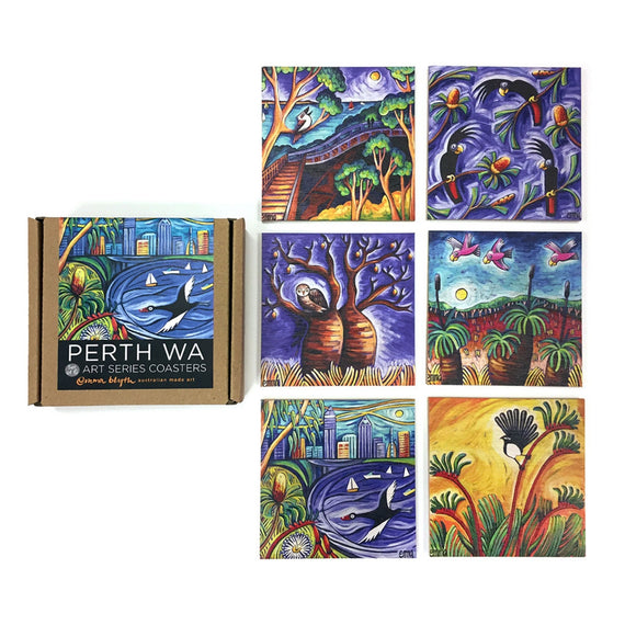 This set of six Perth art series coasters feature images of Emma Blyth's original paintings, printed onto plywood with a cork backing.