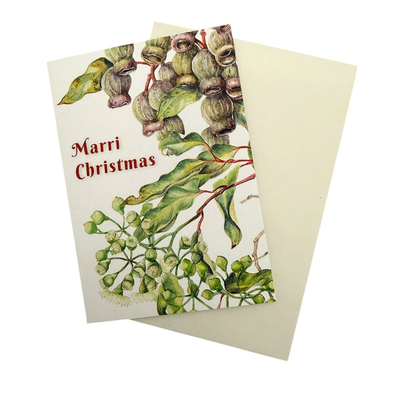 Wishing you a very Marri Christmas! A Christmas card featuring Marri(Corymbia calophylla) painted in watercolour by Philippa Nikulinsky AM.