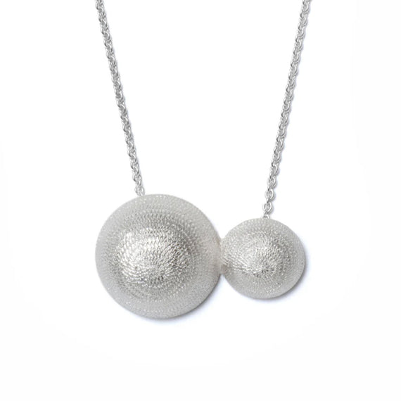 The Dot necklace features two sterling silver domes nestled together on a silver chain. They are painstakingly hand engraved in Lauren's signature texture.
