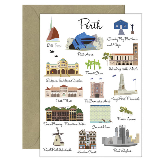 Greeting card showcasing Perth's iconic attractions including Kings Park's own Memorial, Fraser Avenue and of course the spectacular city skyline as seen from the park.
