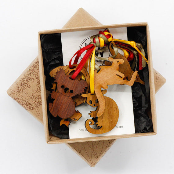Box of 6 little hanging Aussie animal decorations cut from various sustainably harvested timber veneers. Decorations approx 4cm x 4.5cm and hang on ribbon. Decorations arrive in a recycled cardboard gift box.