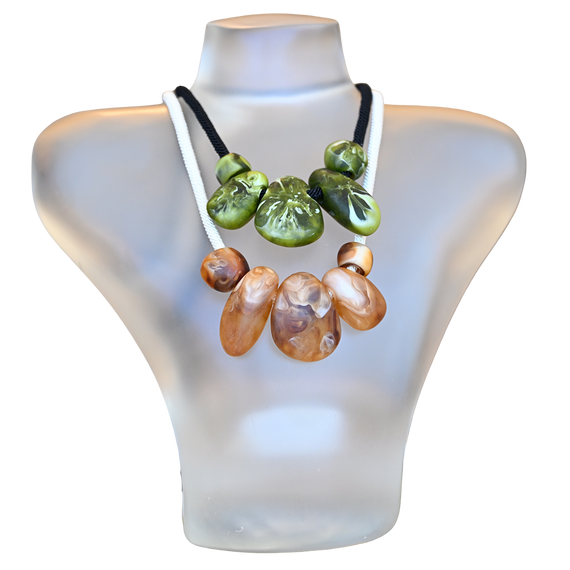 Paying homage to natural rock formations, the Boulder Rock Necklace threads five unique resin beads onto a wool-silk cord. Finished with a brass logo stamp and additional beads at its tail ends, this style can be adjusted by securely knotting the cord to your preferred length.