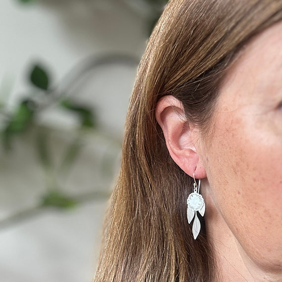 A delicate layering of leaves and flowers, these earrings are inspired by the striking blooms of the Pincushion Hakea found across southwest Western Australia.