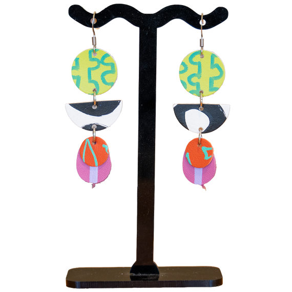 Transform your everyday look with these exquisitely handcrafted First Nations leather dangle earrings. Each pair is thoughtfully hand-painted with contemporary Indigenous designs by Palawan artist Bronwyn David and artfully cut into assorted shapes, suspended from premium stainless-steel hooks for lasting durability and style.