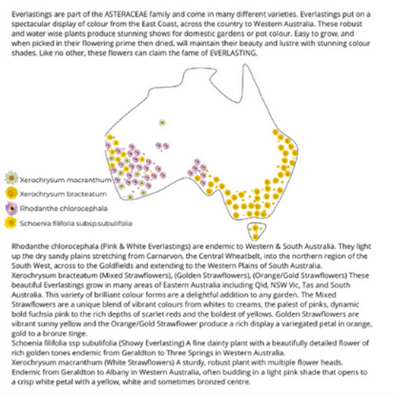 Easiest and quickest to grow of all Australian wildflowers and the most famous of the pink everlastings. Flowers in various shades of pink, salmon and white with centres of yellow, black or yellow and black. One of the many everlastings or paper daisies which cover the Australian bushland with a thick carpet of colour from late winter to summer.