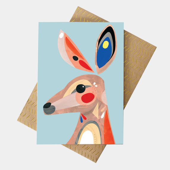 This greeting card features a print of the original 'Kangaroo' collage and acrylic artwork by Pete Cromer.