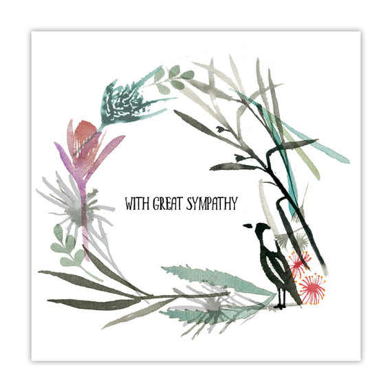 This card design features a magpie and a native wreath of sympathy.