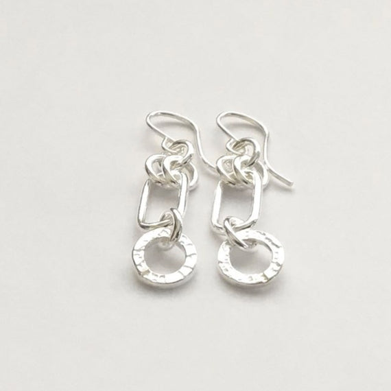 The Orius Earrings are a linear pattern of round textured and polished oval links. These links are connected with polished round links and have sterling silver earwires.