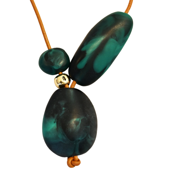 Three smooth resin beads meet with a brass logo bead at the centre of this rock-inspired necklace. Threaded on a vegetable dyed leather cord, the Rock Cluster Pendant can be adjusted by securely knotting the cord to your ideal length.