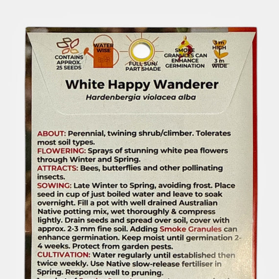 A perennial, twining shrub/climber that tolerates most soil types. Full sprays of stunning white pea flowers through winter and spring.